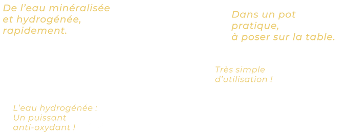 Produit de l’eau hydrogénée sur demande (donc sans temps d’attente).Version Premium : avec un porte filtre supplémentaire, vous offrant ainsi 3 filtres et un dynamiseur d’eau (WCA – système vortex)